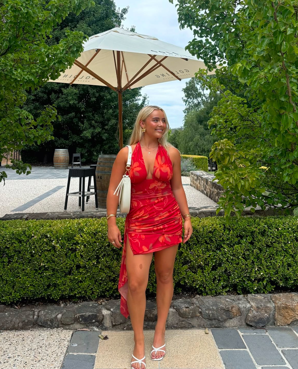 This dress has a halter neck style plunging front cut, with a small split in the side and a ruffle tassel. Material ruches around the waist area allowing multiple sizes to fit throughout.