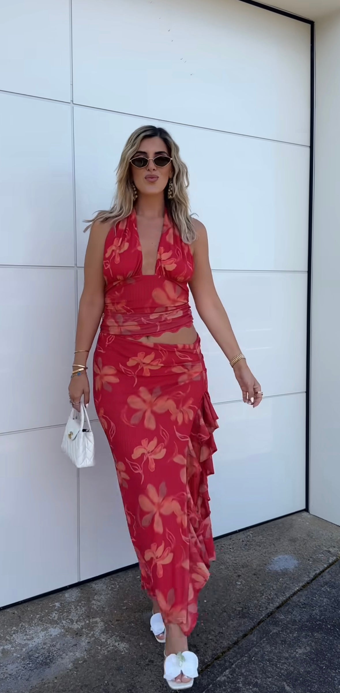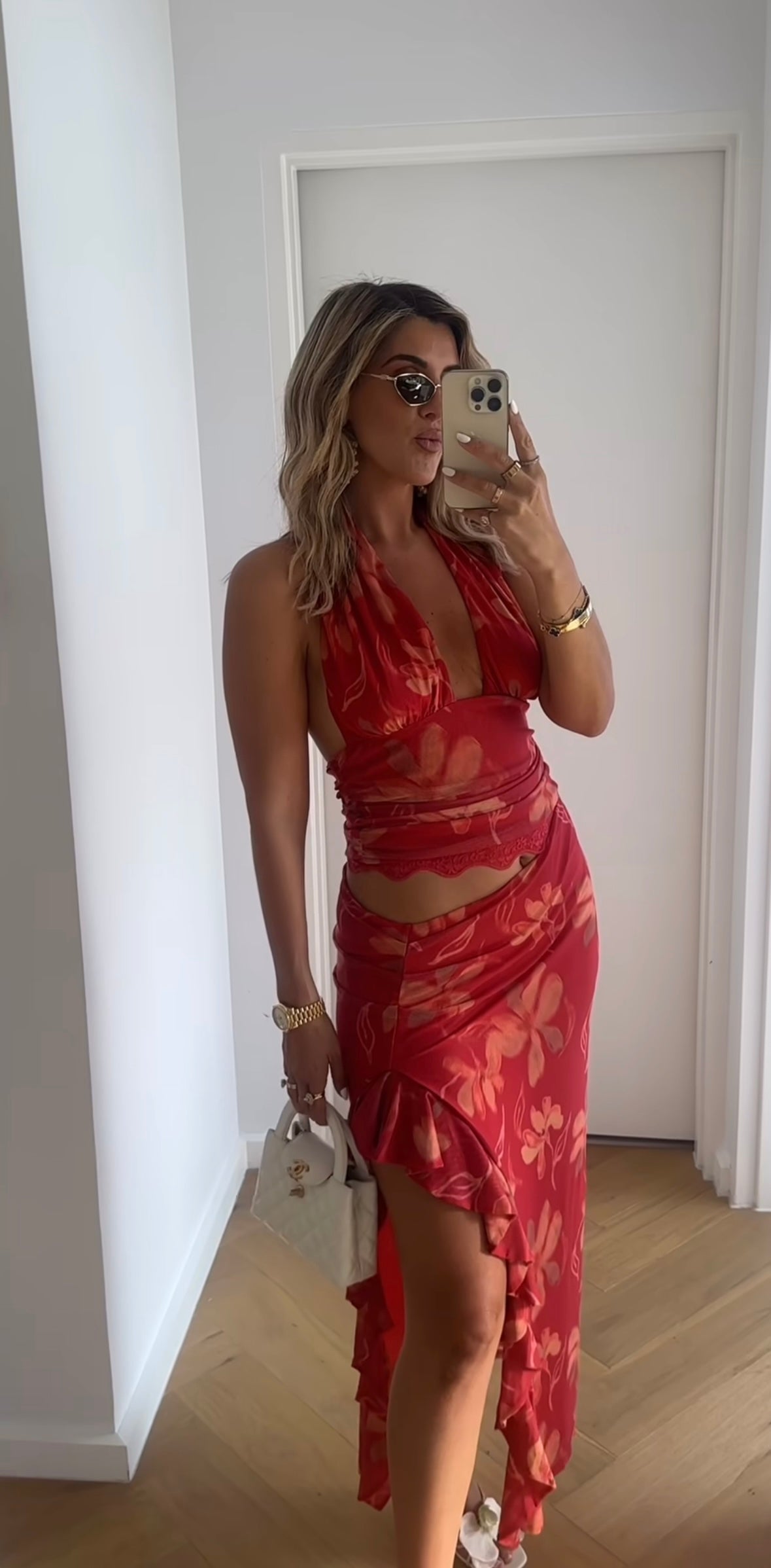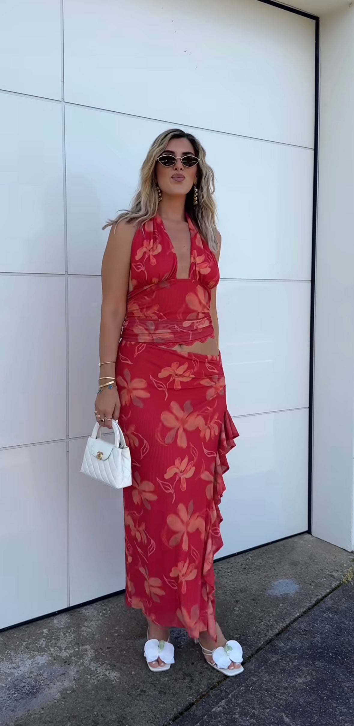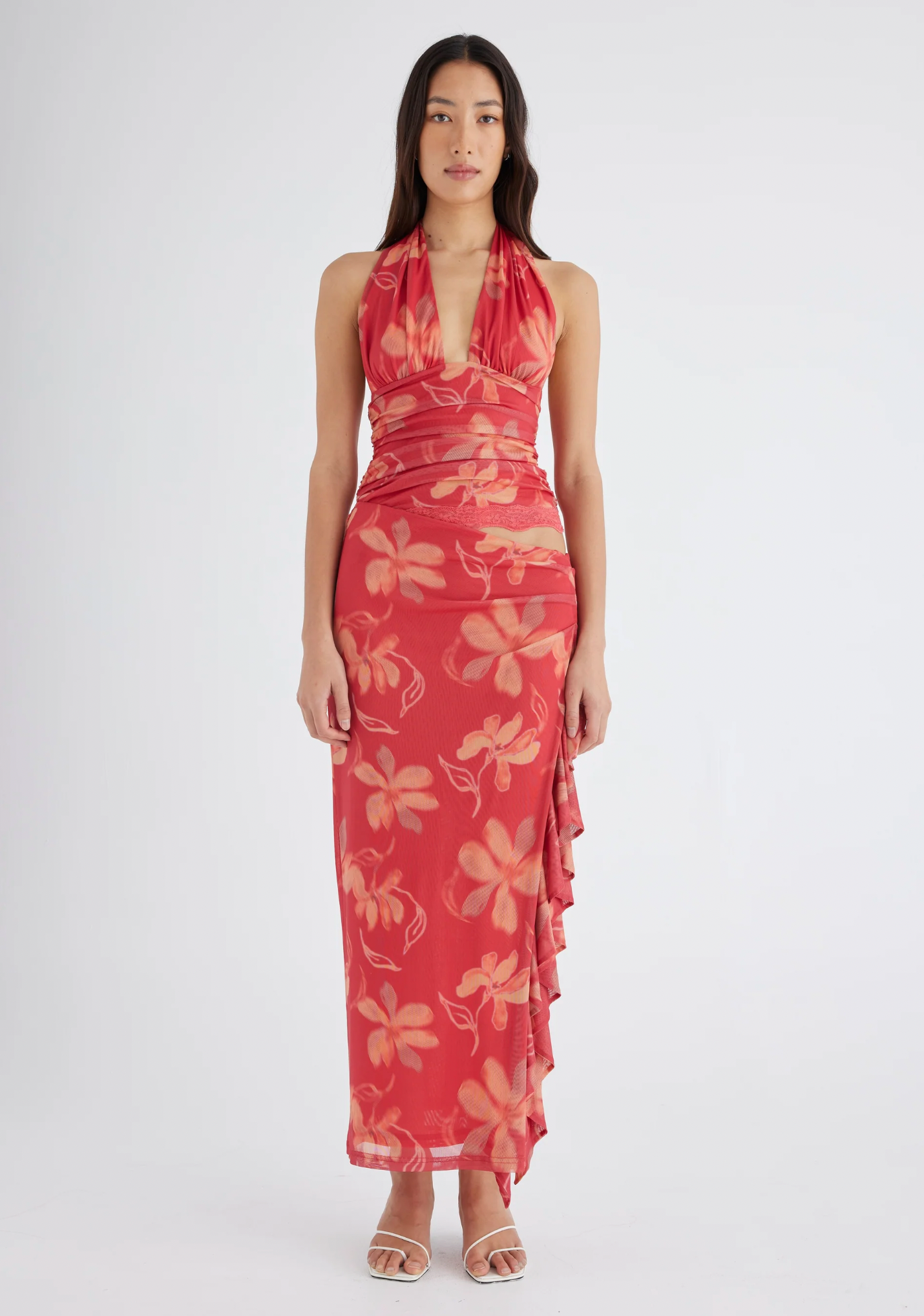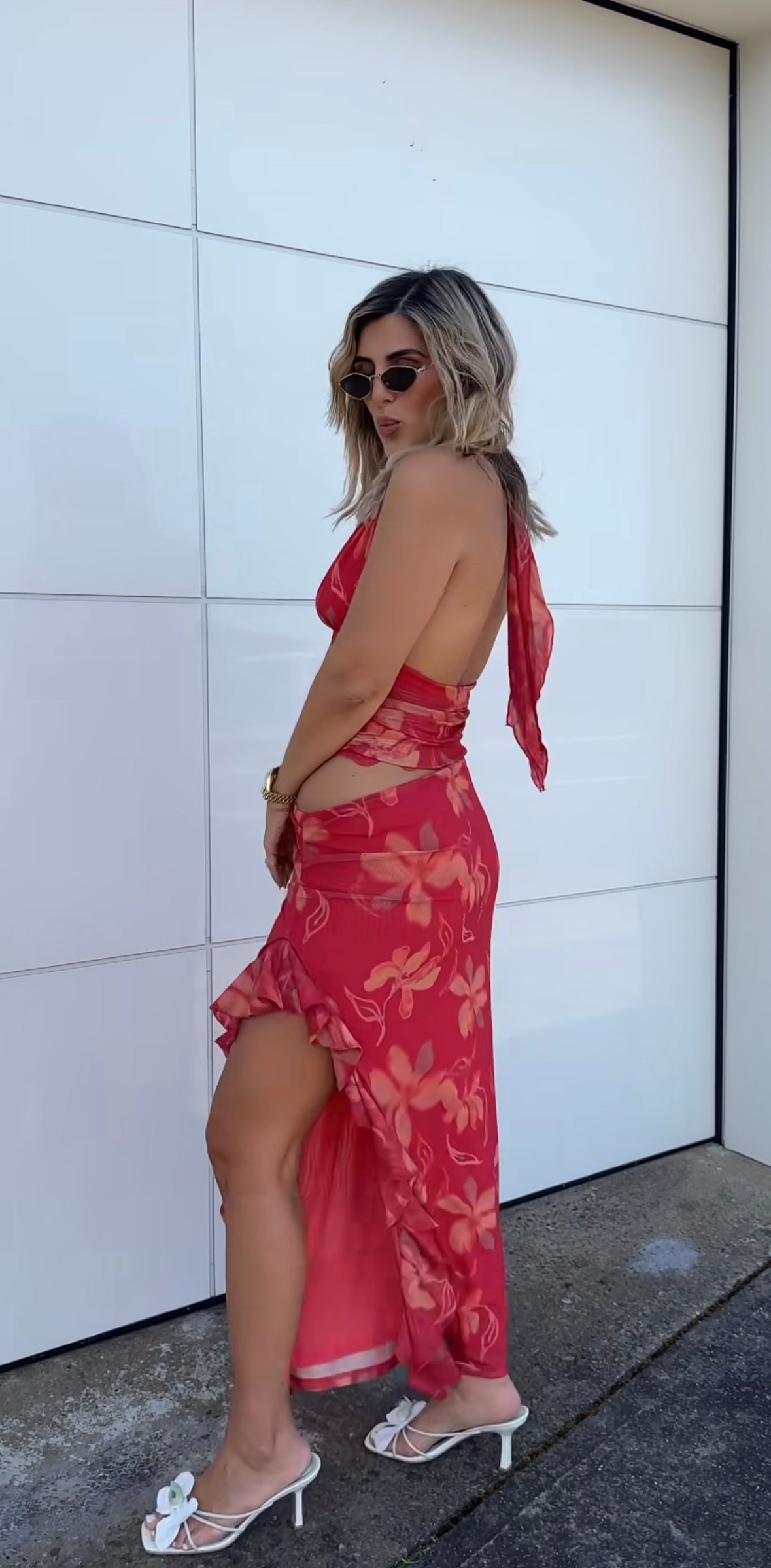 This dress features a halter neck style top and ruching at the waist. The skirt, attached at the wearer’s left side, reveals a hint of the waist and boasts a high split with a ruffle along the hem.