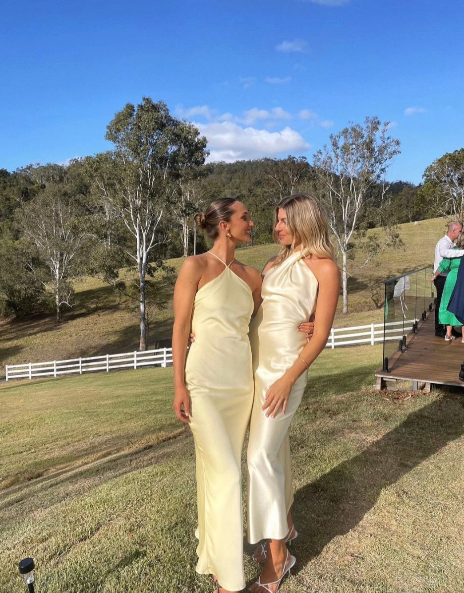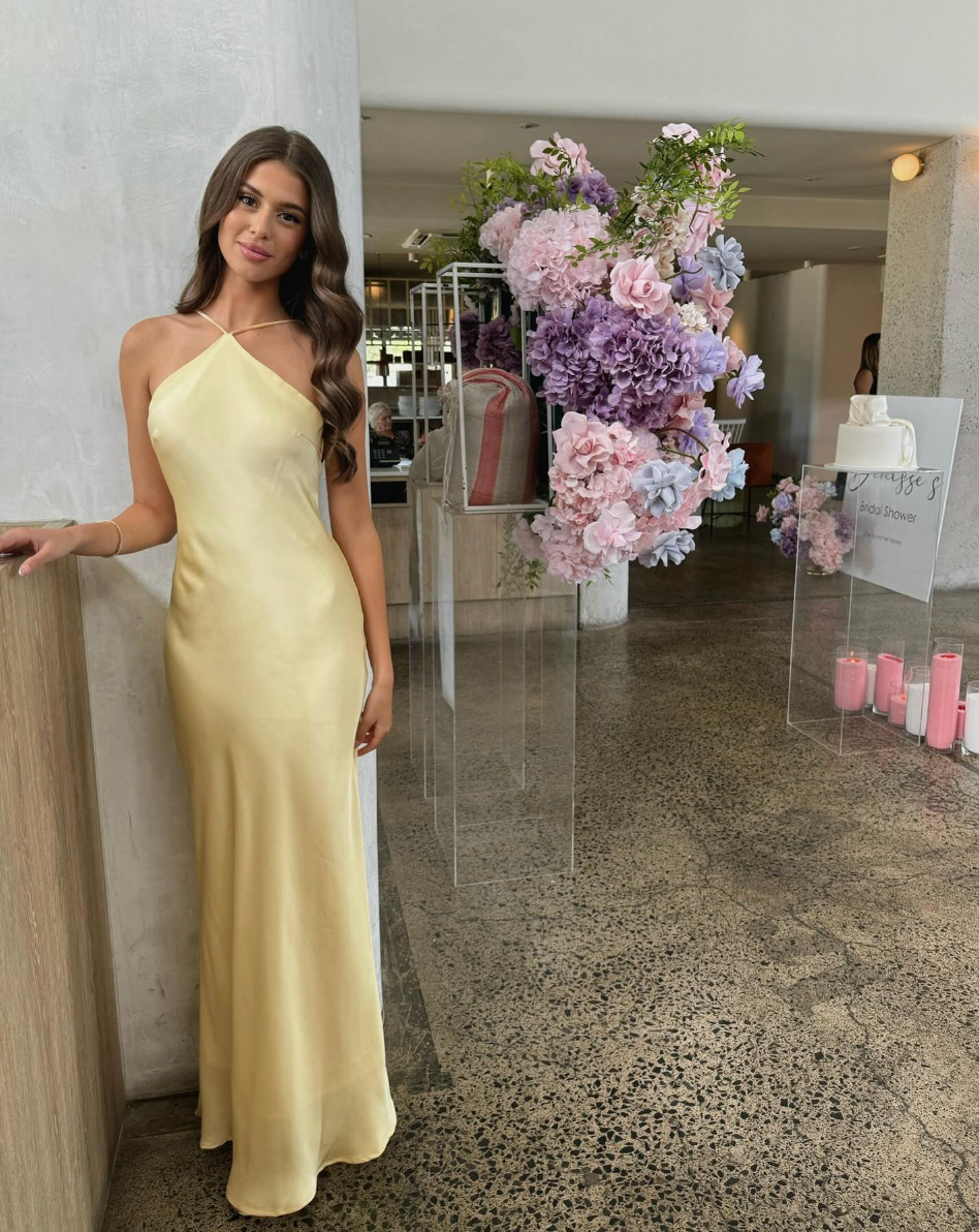 Dress has a halter style neckline with a crossover tie up back which allows adjustability through the neckline.