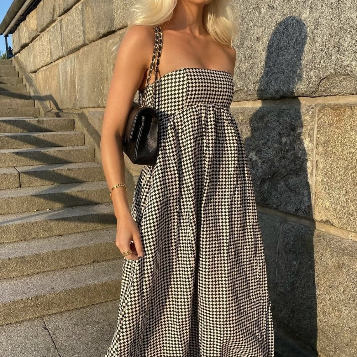 Strapless Maxi dress with houndstooth print. Small elastic finishing on back of dress to allow room for bust sizes.