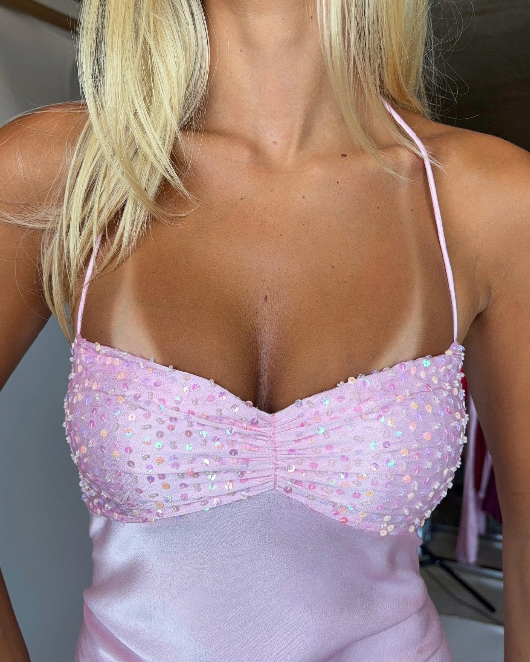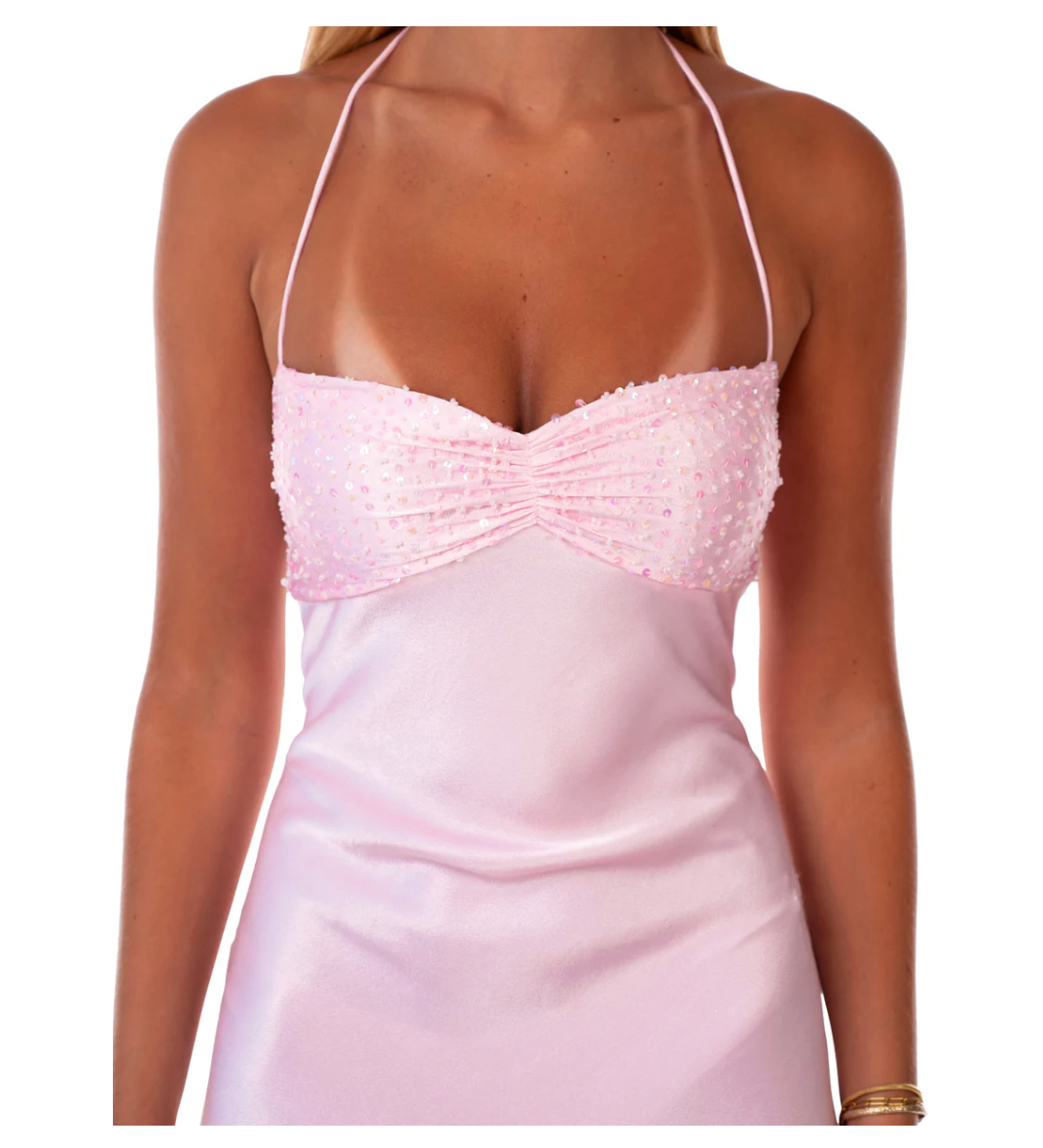 Dress has a halter neck style with a low tie up back and elastic around the bottom scoop of the back of the dress.