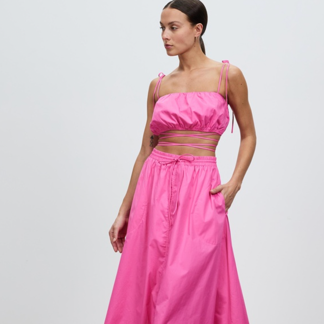 Skirt has an elastic waist band and waist tie for adjusting size, including pockets on the side.