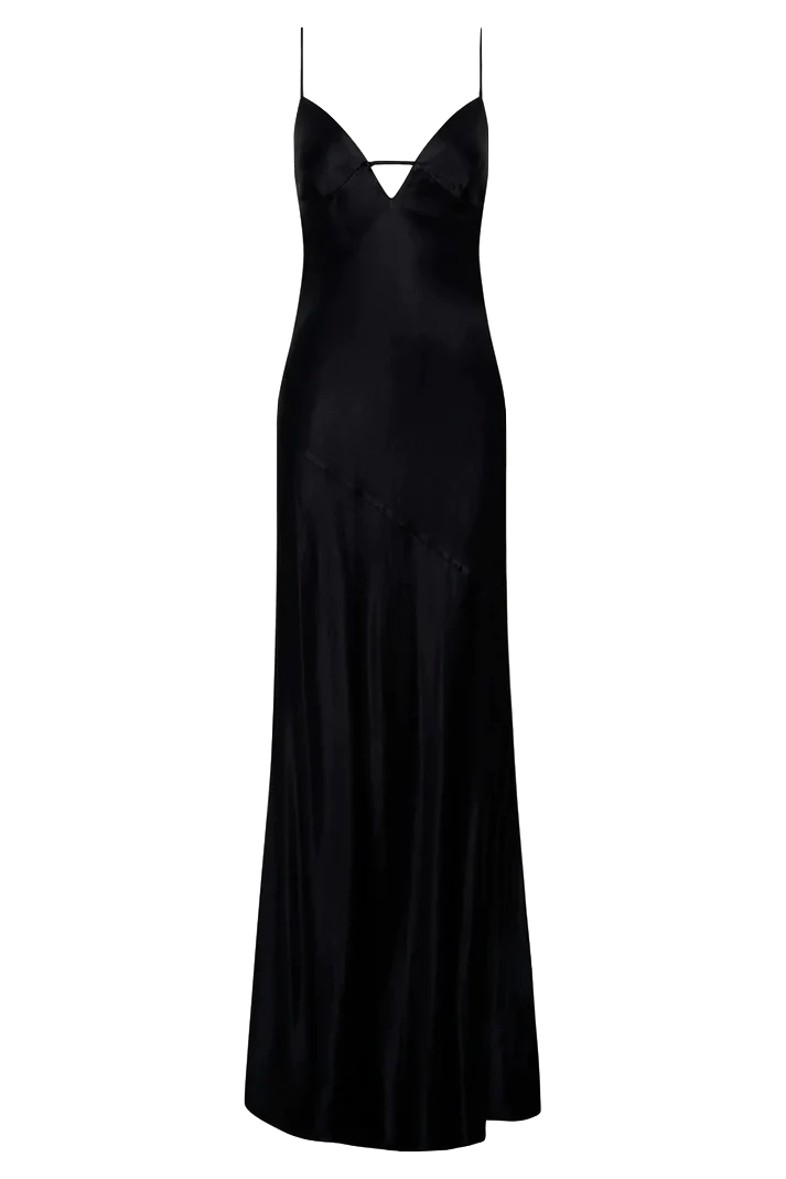 V neckline with keyhole detail. Dress has a tie up open back, this allows multiple sizes to fit as the back is completely adjustable to your desired size.