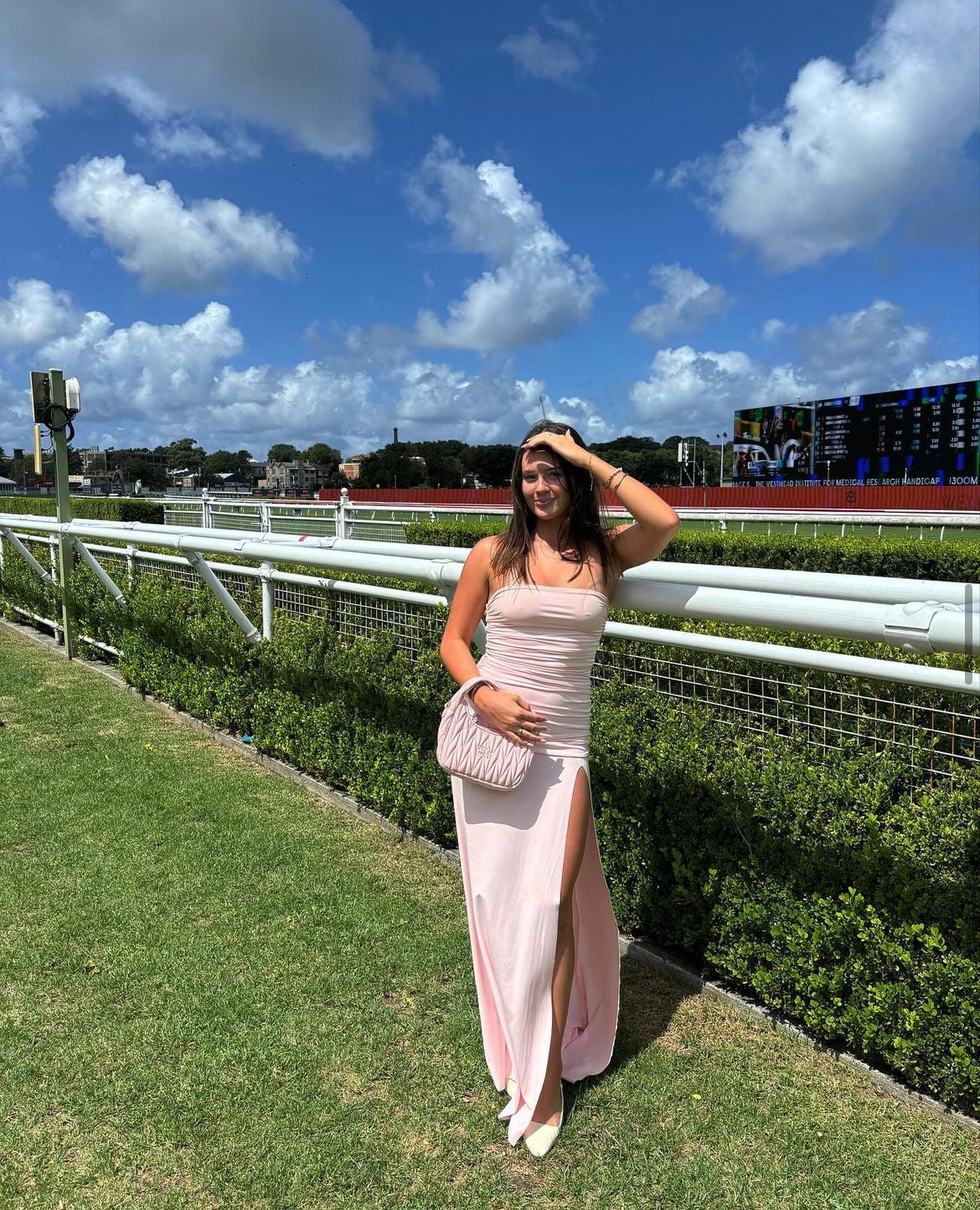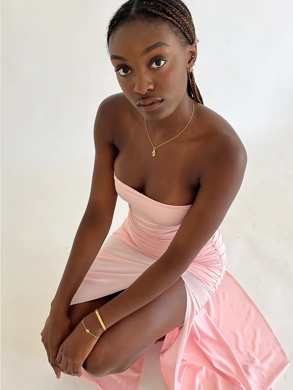 Dress is a strapless maxi, with a leg split, and body ruching.