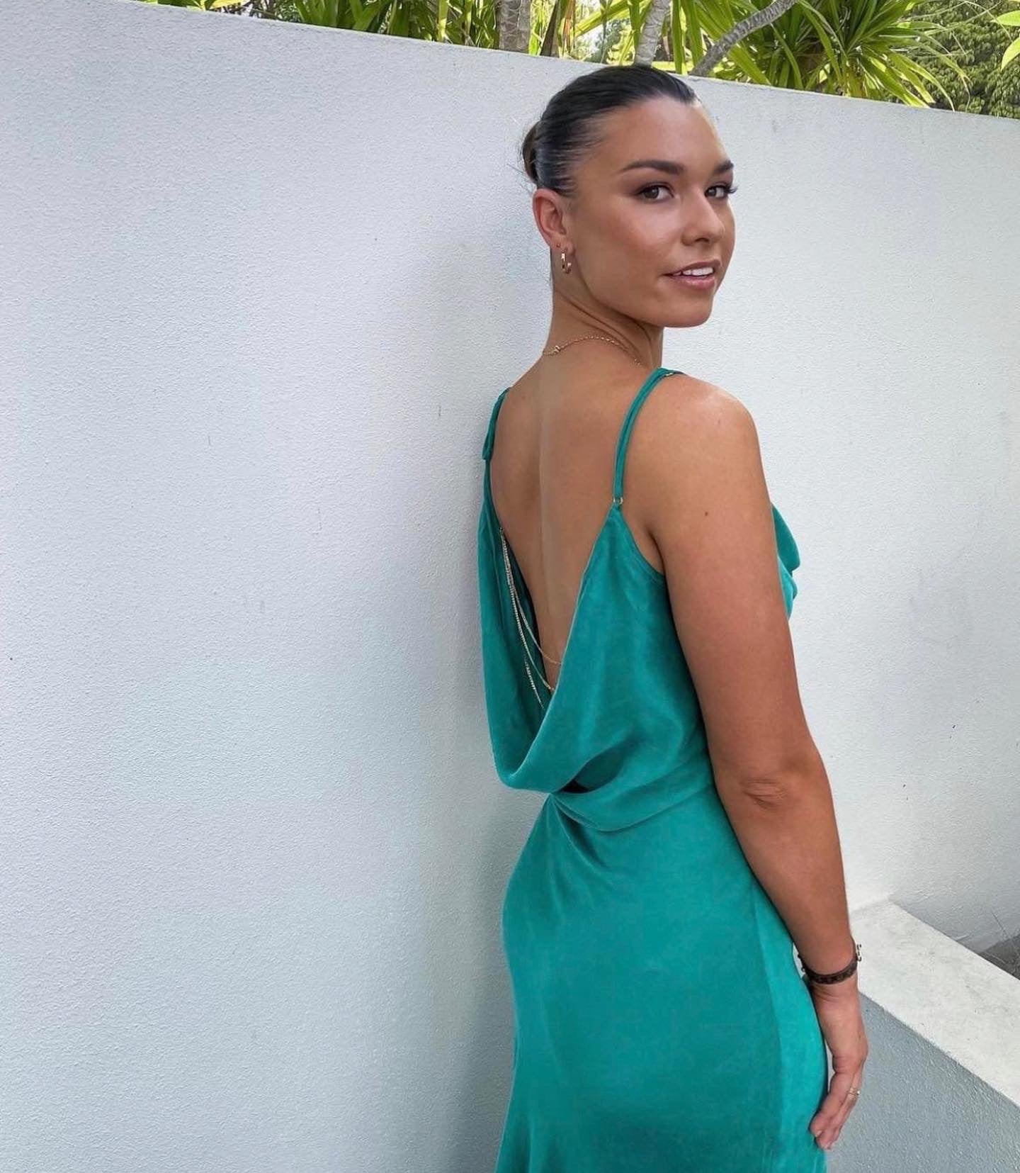 Dress comes with adjustable straps, and detachable chain + front and low back cowl neck.