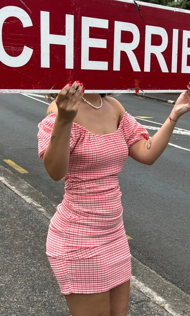 Dress is a slip on entry with ruched elastic bust and sides. This allows for multiple sizes to fit.