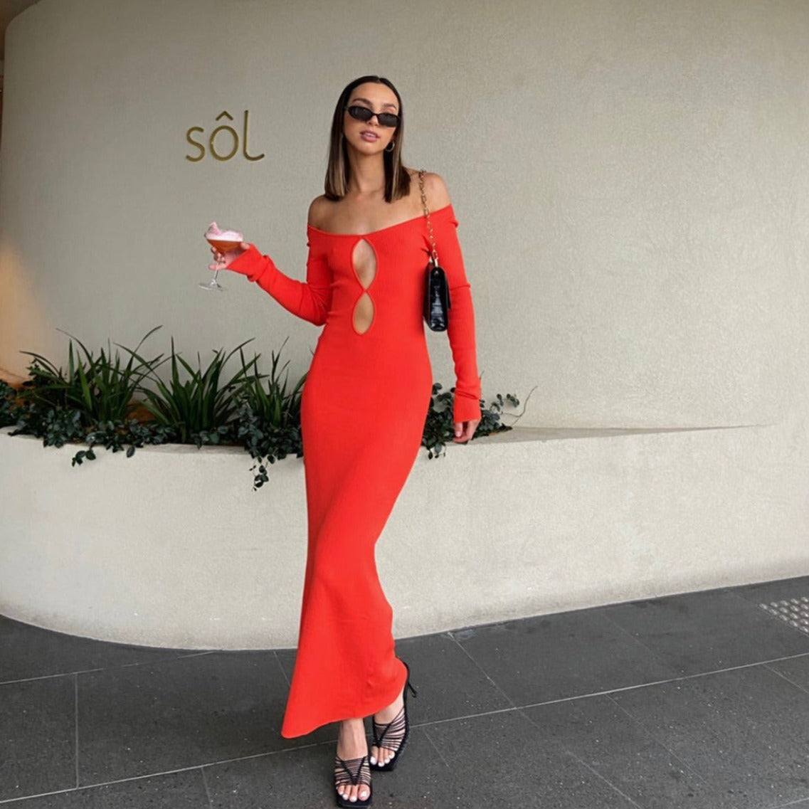 A long sleeve thick knitted maxi dress, that can be worn with the neckline lower for an off the shoulder look or up on the the shoulders for a higher neckline and more security through the bust.